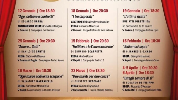 - 12 Gennaio: La Compagnia dei Mercanti di Salerno inaugurerà la rassegna con “Ago, cuttone e cunfietti”, un’opera di E. Barra adattata da B. di Pasqua.