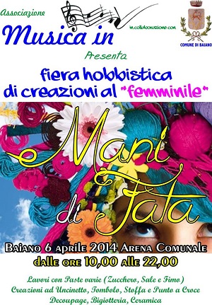 L’associazione “Musica In” in collaborazione con il Comune di Baiano organizza nell’Arena Comunale, domenica 6 aprile 2014, la Prima Fiera Hobbistica di Creazioni al Femminile: “MANI DI FATA 2014”. Ci saranno esposizioni e realizzazioni di lavori handmade con l’utilizzo di paste varie ( zucchero, sale, fimo); ceramiche; uncinetto, tombolo, stoffa, punto a croce; decoupage; bigiotteria.
