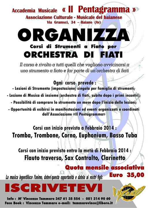 L’accademia musicale “Il Pentagramma” organizza corsi per strumenti a fiato per comporre una orchestra di fiati. Ogni corso prevede lezioni ed opportunità di esibirsi all’interno di manifestazioni ed eventi ideati dall’Associazione. La quota mensile per le iscrizioni è di 35 euro a persona. “Il mandamento baianese ha sempre prodotto tanti bravi strumentisti a fiato. E’ ora di rivalorizzare la nostra cultura. Nel nostro piccolo, noi dell’ Accademia Musicale “Il Pentagramma”, cerchiamo con tutti i mezzi di portare avanti queste tradizioni. Giovani e meno giovani iscrivetevi, la musica ringiovanisce e rinvigorisce gli animi”.