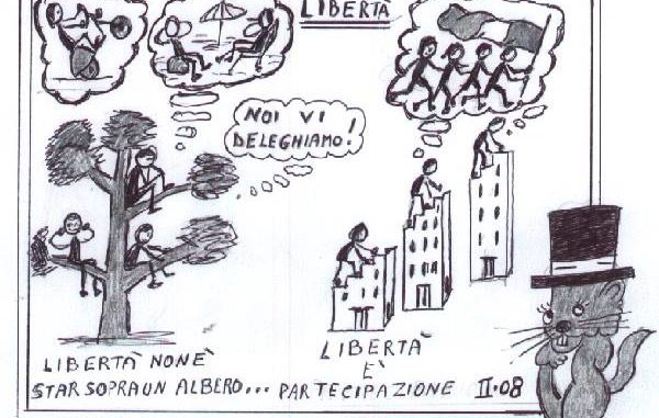 “La libertà non è star sopra gli alberi!” cantava Giorgio Gaber. in una sua famosissima canzone del 1972. “Libertà è partecipazione!” Purtroppo, però, l’uomo “passa la sua vita a delegare e nel farsi comandare ha trovato la sua nuova libertà!”