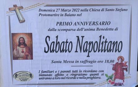 Domenica 27 marzo 2022 nella Chiesa di Santo Stefano Protomartire in Baiano nel Primo Anniversario della scomparsa dell’anima Benedetta di Sabato Napolitano sarà celebrata una Santa Messa in suffragio alle ore 18. I familiari e i parenti tutti lo ricordano con immutato affetto e ringraziano quanti si uniranno a loro ricordo e nella preghiera.