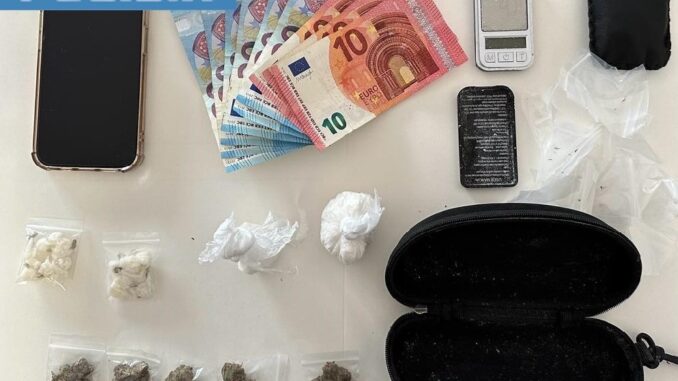 I poliziotti, dopo averlo recuperato, hanno rinvenuto al suo interno 5 involucri di marijuana del peso di 6.5 grammi circa, 22 dosi di cocaina del peso di 6.5 grammi circa, 2 involucri della stessa sostanza del peso di 35 grammi circa, un bilancino di precisione e diverso materiale per il confezionamento della droga; all’interno dell’abitazione , gli operatori hanno rinvenuto un telefono cellulare e 150 euro, chiaro provento dell’attività delittuosa.