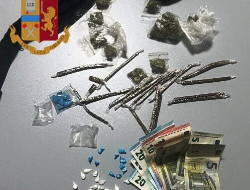 I poliziotti, dopo un breve inseguimento, hanno raggiunto lo spacciatore che ha iniziato a dare in escandescenze minacciandoli con un coltello e sferrando un calcio contro il paraurti della volante fino a quando, non senza difficoltà e dopo una colluttazione, è stato bloccato e trovato in possesso di 16 bustine contenenti circa 16 grammi di marijuana, 18 stecche di hashish del peso di circa 30 grammi, 30 involucri di cui 10 con 1,3 grammi di eroina e 20 con 2,55 grammi di cocaina, 10 pasticche di metanfetamina e 145 euro.