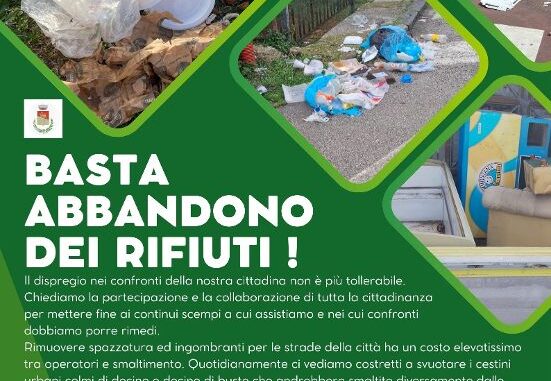 Dunque si chiede la partecipazione e la collaborazione di tutta la cittadinanza: innanzitutto per porre in essere un sempre più corretto conferimento differenziato dei rifiuti, a chi ha l’incivile abitudine di abbandonarli per strada e nelle campagne si chiede perentoriamente di non perseverare nell’errore, ma anche ai cittadini più corretti ed attenti l’invito è a segnalare episodi e comportamenti incivili alla Polizia Municipale.