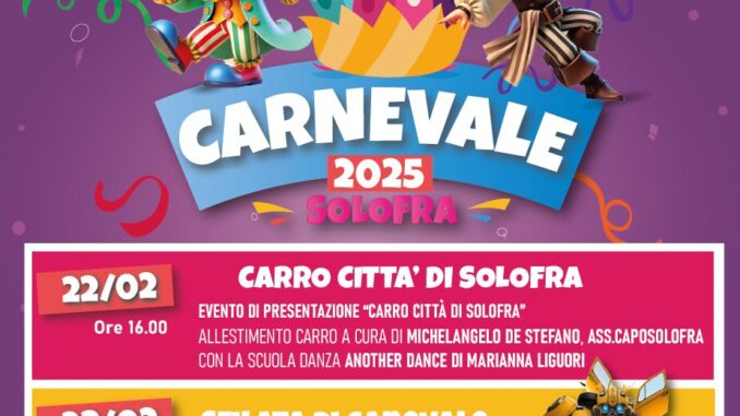 Fai La Pro Loco di Solofra è lieta di annunciare l’edizione 2025 del Carnevale Solofrano: tre giornate ricche di eventi, colori e tradizione che sapranno coinvolgere grandi e piccini, pronte a trasformare la città in un grande palcoscenico di allegria e spettacolo.