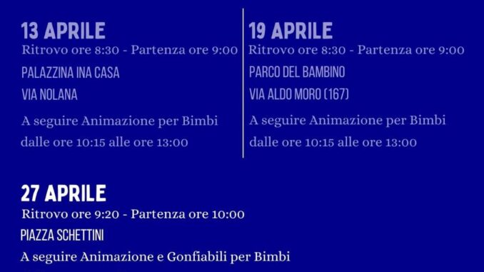 • 13 aprile: ritrovo alle ore 8:30 presso la Palazzina INA Casa in via Nolana, con partenza alle ore 9:00. A seguire, animazione per bambini dalle 10:15 alle 13:00.