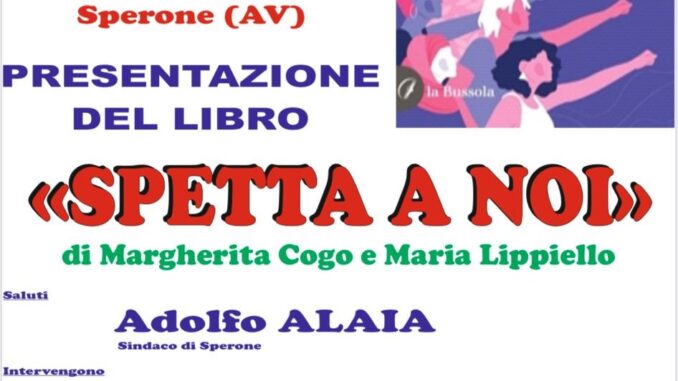 Venerdì 6 dicembre 2024, alle ore 18:00, presso l’Aula Consiliare del Palazzo Comunale di Sperone (AV), in Piazza Luigi Lauro, si terrà la presentazione del libro “Spetta a Noi”, scritto da Margherita Cogo e Maria Lippiello.