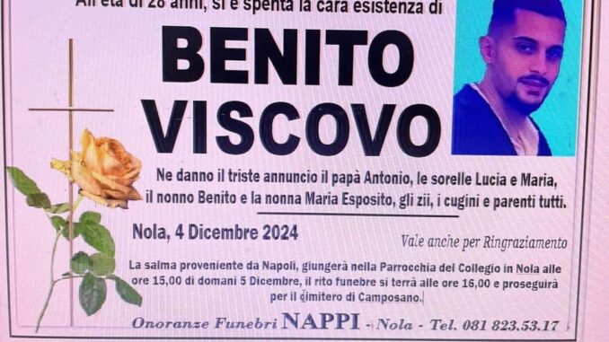 Nola – Si terranno domani, giovedì 5 dicembre 2024, alle ore 16, presso la Parrocchia del Collegio di Nola, i funerali di Benito Viscovo, il giovane di 28 anni tragicamente scomparso. La comunità è profondamente scossa per la notizia della sua morte, avvenuta nel carcere di Poggioreale, dove il ragazzo si è tolto la vita.