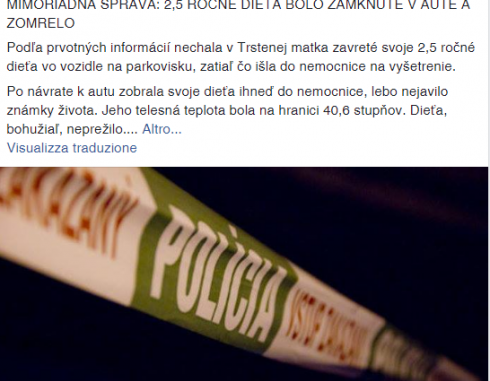 Una bimba di due anni e mezzo lasciata dentro un’automobile è morta ieri per il caldo nella cittadina di Trstena, 7.000 abitanti nella Slovacchia del nord, al confine con la Polonia. Secondo le informazioni fornite dalla polizia regionale di Zilina, la madre trentenne aveva lasciato la figlia in macchina in un parcheggio davanti all’ospedale locale, mentre lei era entrata per un esame. Quando è tornata, ha trovato la piccola Sabina ormai incosciente e nemmeno i sanitari del nosocomio hanno potuto riportarla in vita. La temperatura corporea della bambina, ha scritto la polizia sulla sua pagina ufficiale di Facebook, era di 46 gradi. Un dato poi corretto (!) a 40,6 gradi centigradi. La polizia ha iniziato una indagine per abbandono e uccisione di un minore. La madre, Jana, sarebbe una ginecologa e sarebbe incinta. Ogni volta che la cronaca riporta questo tipo di tragedie, sembra impossibile che possa succedere. Eppure i casi di bambini piccoli che muoiono dimenticati in auto sui sedili o legati al seggiolino non sono così rari e capitano in famiglie normalissime ed a genitori apparentemente impeccabili e incapaci di fare del male ai propri figli. Per i bambini restare in auto è molto più pericoloso che per gli adulti. Si chiama ipertermia, la loro temperatura corporea si alza più velocemente. Può arrivare già dopo 20 minuti e la morte sopraggiungere in due ore secondo quanto spiega un opuscolo del ministero della Sanità. In auto poi la temperatura può toccare i 40 gradi anche se fuori ce ne sono poco più di 20. Quest’ennesimo dramma però dev’essere da monito affinché non accada mai più.