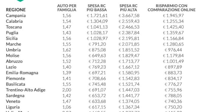 La Campania è la regione con la convenienza più alta: le famiglie con più di un’auto da assicurare in questa regione, con il confronto online, possono risparmiare fino a 1.946 euro circa.
