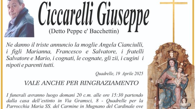Quadrelle – Si è spento all’età di 60 anni Giuseppe Ciccarelli, conosciuto da tutti come “Peppe ‘e Bacchettin”. La notizia della sua scomparsa ha profondamente colpito la comunità locale, dove Giuseppe era benvoluto e stimato.