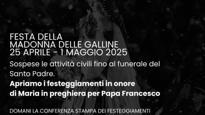 In segno di rispetto per la scomparsa di Papa Francesco, l’edizione 2025 dei festeggiamenti in onore della Madonna del Carmelo, detta “delle Galline”, si aprirà con un forte spirito di raccoglimento e preghiera. Il lutto che ha colpito l’intera comunità cristiana ha portato gli organizzatori a sospendere temporaneamente tutte le attività del programma civile previste fino al termine delle esequie del Santo Padre.