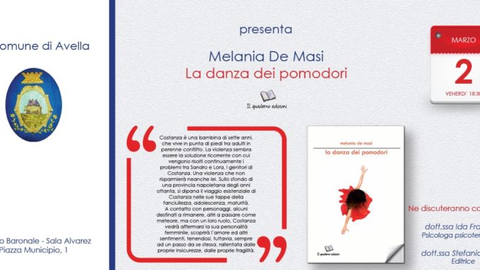 Venerdì 2 marzo alle ore 18.30, presso la Sala Alvarez del Palazzo Baronale, il Comune di Avella presenta il libro “La Danza dei Pomodori” Il Quaderno Edizioni, scritto da Melania De Masi. Ne discuteranno con l’autrice Ida Franzese, psicologa psicoterapeuta e l’editrice Dott.ssa Stefania Spisto.