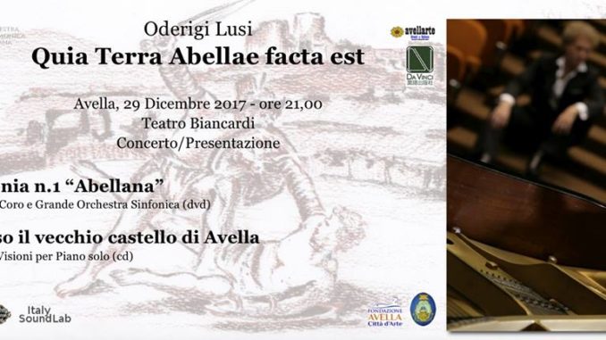 Il maestro pianista avellano Oderigi Lusi il 29 dicembre presso il Teatro-Auditorium Biancardi alle ore 19.00 presenterà al pubblico il DvD dell’opera “Sinfonia Abellana”. Le meravigliose immagini sono state girate nel settembre 2014 presso l’antico anfiteatro durante il gran concerto con l’Orchestra Filarmonica Campana in occasione di “ClanioinArte”.Lusi eseguirà in prima assoluta una riduzione pianistica del IV e V Movimento della Sinfonia e le quattro visioni per piano solo “Presso il Vecchio Castello di Avella”.Quest’ultima è la sua seconda opera dedicata alla sua città natale. Durante la serata saranno disponibili la partitura edita da OMK-Da Vinci Edition, il cd, e il cd in versione cartoncino deluxe fatto a mano ad opera di Bibelot Arte .