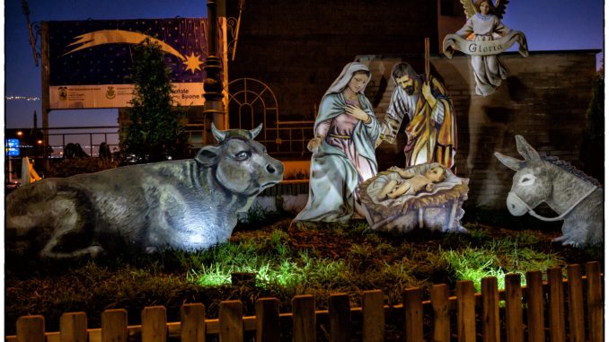 La rappresentazione della Natività realizzata con materiali ecosostenibili, legno, carta, sabbia, cortecce, addobbata con la piantumazione di piccoli alberi che rimarranno sul luogo in modo permanente. Il fine ultimo è quello di ridurre al massimo l’impatto ambientale con il riciclo e il riuso, permettendo di riutilizzare materiali di scarto, di trasformarli, dando vita a nuovi oggetti. Alla realizzazione dell’idea del riciclo creativo fortemente voluta dal vicesindaco della Città Metropolitana hanno lavorato tre Artisti del luogo, Mario Pierro, Domenico Alfieri e Gabriele Pierro. Il forte segnale dell’ecosostenibilità, oltre ad essere presente nei grandi settori produttivi, come afferma Iovino coinvolge soprattutto i consumatori, che sono chiamati ad agire in modo virtuoso tramite azioni quotidiane ecologiste, dall’attenzione allo spreco energetico e alimentare, dalla raccolta differenziata, alla scelta di prodotti e marchi sostenibili. L’istallazione artistica simbolo del Natale è allocata all’aperto nell’incrocio tra Corso Italia, via del Frasso e via Emanuele Gianturco del comune di Saviano città del Carnevale.
