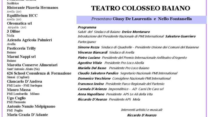 Il Premio Internazionale Anfiteatro d’Argento Cultura e Imprenditoria che consegnerà ufficialmente i 22 riconoscimenti per la cultura, l’imprenditoria, la storia ai premiandi , evento che sarà guidato, come sempre, dal giornalista Nello Fontanella, che pur essendo impegnato a Napoli per l’arrivo della 9° tappa del giro d’Italia (Avezzano – Napoli) ha garantito la sua presenza alla kermesse di sabato 11 maggio al teatro Colosseo di Baiano, affiancato da Giusy De Laurentis, dirigente dell’ Istituto nazionale di documentazione, innovazione e ricerca educativa e impegnata animatrice culturale baianese. Un ricco programma artistico animerà la serata: nella hall del teatro, gli ospiti potranno ammirare la mostra il “Ricicl’art” di Cettina Prezioso, artista della cartapesta; e quella permanente di fotografia di Joseph Noviello dedicata alla Festa del Maio di Baiano.