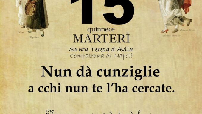 ‘O PRUVERBIO D’ ‘O JUORNO. Martedì 15 ottobre 2024 15/10/2024 binews.it 100 DI QUESTI GIORNI, ATTUALITA', EVIDENZA, Il Proverbio del Giorno 0 di Gianni Polverino Nun dà cunziglie a cchi nun te l’ha cercate. Non essere mai invadente ad elargire consigli non richiesti.