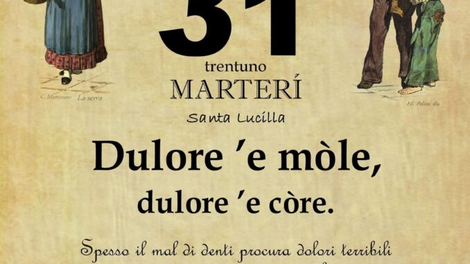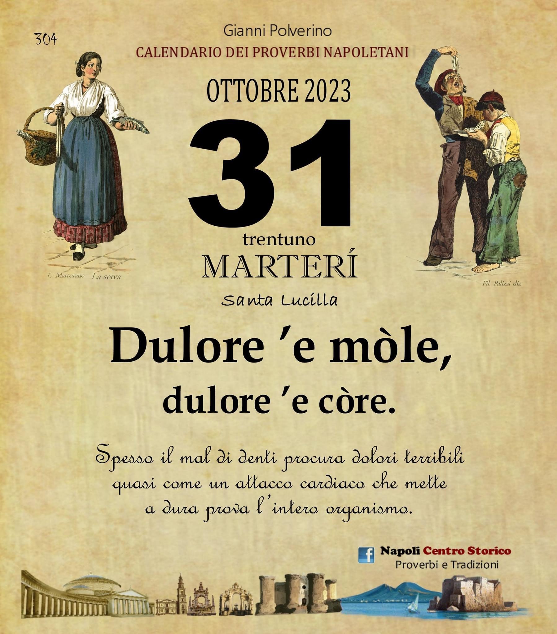 ‘O PRUVERBIO D’ ‘O JUORNO. Martedì 31 ottobre 2023 31/10/2023 binews.it 100 DI QUESTI GIORNI, ATTUALITA', EVIDENZA, Il Proverbio del Giorno 0 di Gianni Polverino Dulore ’e mòle, dulore ’e còre. Spesso il mal di denti procura dolori terribili quasi come un attacco cardiaco che mette a dura prova l’intero organismo.