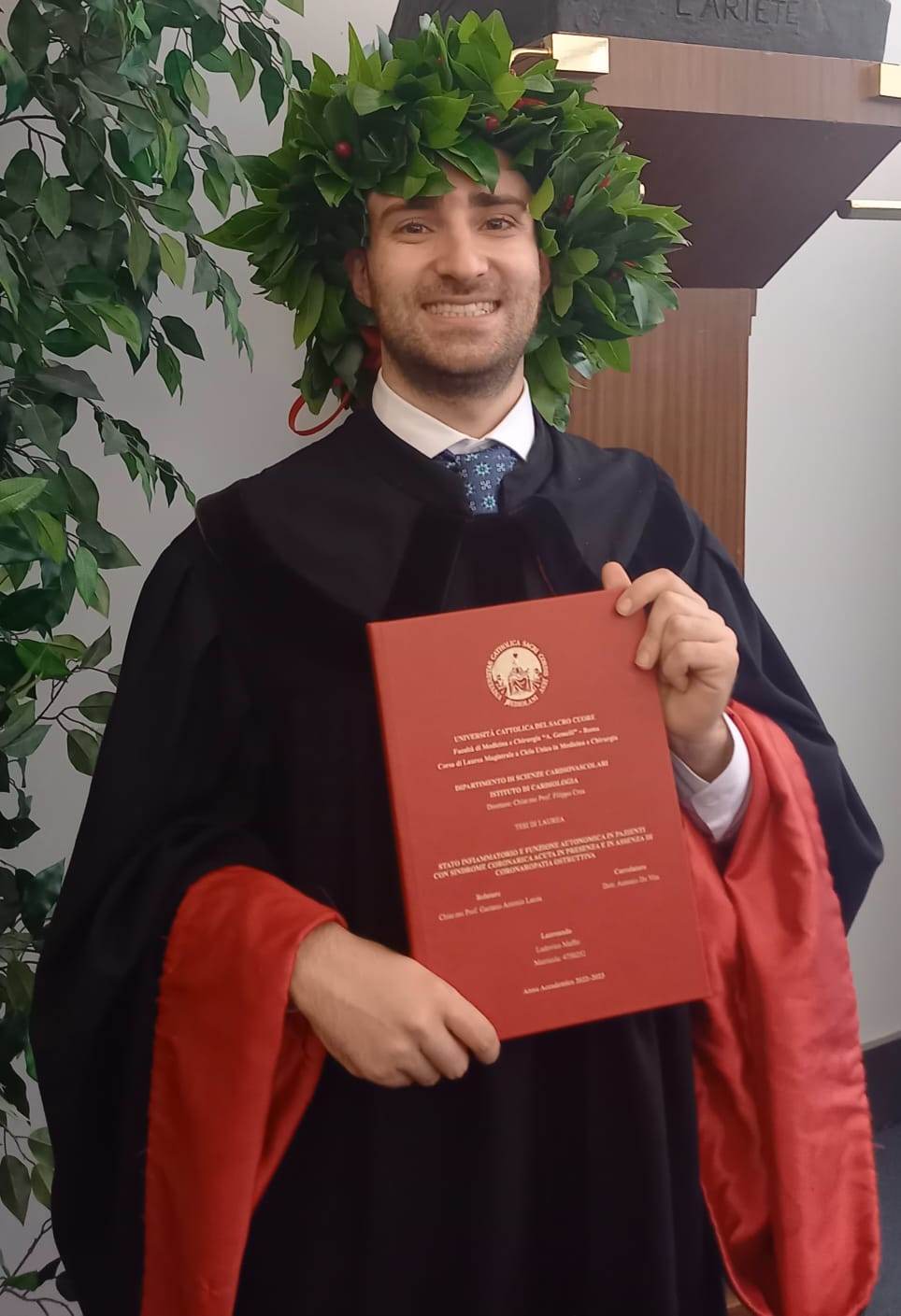 Il dottor Maffei, il 20 giugno 2023, ha discusso un’interessantissima tesi di laurea dal titolo “Stato infiammatorio e funzione autonomica in pazienti con sindrome coronarica acuta in presenza e in assenza di coronaropatia ostruttiva”, un eccelso lavoro scientifico che è stato elogiato dal relatore, il chiarissimoprofessore Gaetano Antonio Lanza, e dal correlatore, il dottor Antonio De Vita.