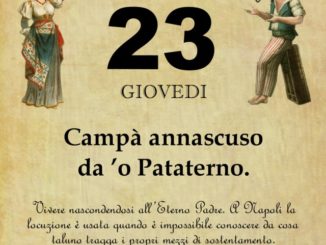 [responsivevoice_button voice=”Italian Female” buttontext=”Ascolta l’articolo”] di Gianni Polverino Campà annascuso da ’o Pataterno. Vivere nascondendosi all’Eterno Padre. A Napoli la locuzione è usata quando è impossibile conoscere da cosa taluno tragga i propri mezzi di […]