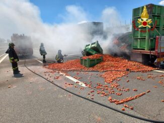 VALLATA (AV). A fuoco autoarticolato che trasporta pomodori.