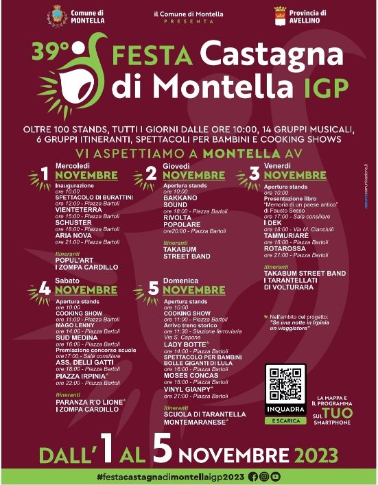 Oltre 100 stands, showcooking, spettacoli, esibizioni e musica, guideranno gli avventori in uno straordinario itinerario che qualifica e promuove la Castagna di Montella Igp, simbolo della cultura agroalimentare del territorio e della sua comunità.