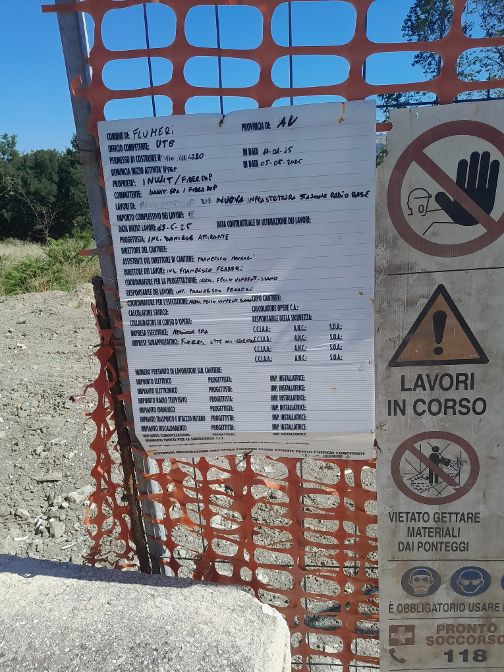 Dal cartello esposto dei lavori ( per la verità laconico e non molto leggibile), si nota, che l’autorizzazione per la costruzione delle opere in C. A. e si presume anche l’innalzamento della torre in traliccio metallico è stata data dall’ Ufficio Tecnico Comunale ( UTC ) del comune di Flumeri, in data 17-01-2025 e i lavori, sono stati iniziati in data 05 maggio o giugno 2025.