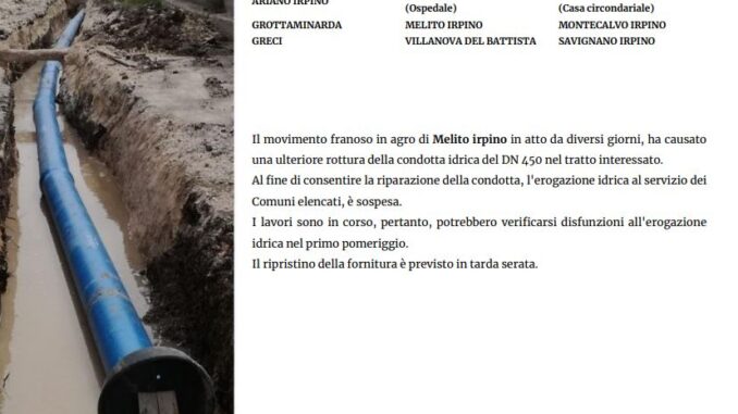 L’Alto Calore servizi ha informato, tramite PEC, i comuni interessati che il movimento franoso in agro di Melito Irpino in atto da giorni, ha causato un’ulteriore rottura della condotta idrica del diametro di 450 mm nel tratto interessato. Al fine di consentire la riparazione della condotta, l’erogazione idrica al servizio di 8 Comuni sarà sospesa. I lavori sono in corso, pertanto, potrebbero verificarsi disfunzioni all’erogazione idrica nel primo pomeriggio. Il ripristino della fornitura è previsto in tarda serata.