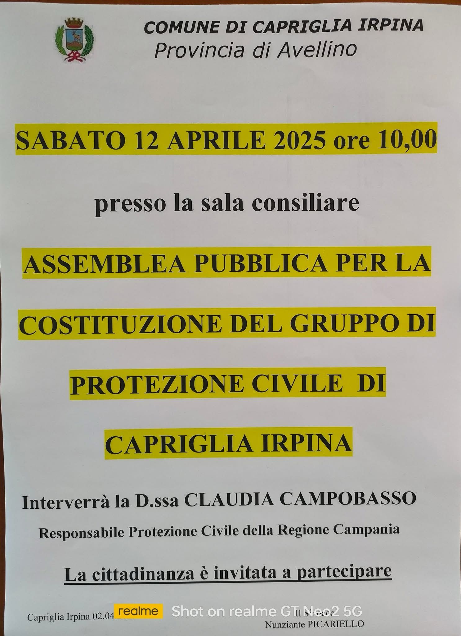 Il Comune di Capriglia Irpina, in provincia di Avellino, invita tutta la cittadinanza a partecipare all’assemblea pubblica che si terrà sabato 12 aprile 2025 alle ore 10:00 presso la sala consiliare del Comune. L’incontro ha come obiettivo la costituzione del Gruppo di Protezione Civile di Capriglia Irpina, un’iniziativa fondamentale per migliorare la sicurezza e la gestione delle emergenze nel territorio.