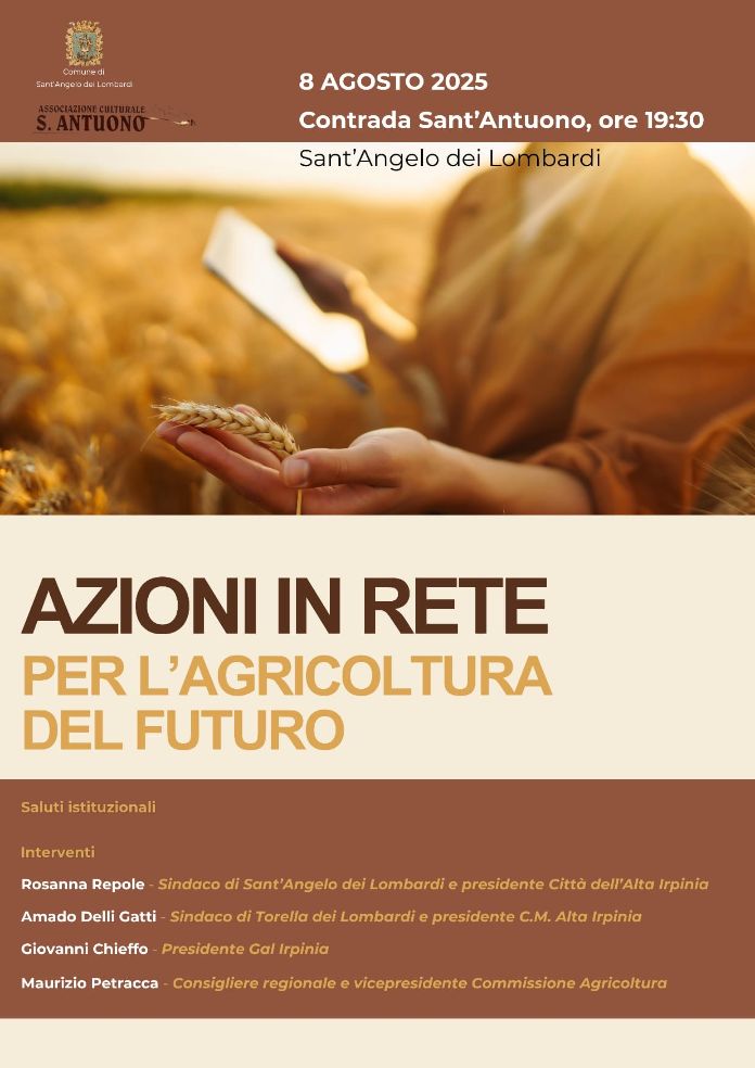 Si terrà venerdì 8 agosto il convegno “Azioni in rete per l’agricoltura del futuro”. Promosso dal Comune di Sant’Angelo dei Lombardi e dall’Associazione culturale Sant’Antuono, l’appuntamento è previsto alle ore 19:30 in contrada Sant’Antuono, luogo della tradizionale Festa della Trebbiatura dal 7 all’11 agosto. Sarà un momento per fare il punto sullo stato dell’agricoltura in Alta Irpinia e sulle prospettive per il futuro. Cambiamenti, risorse, potenzialità, criticità, ambiente e innovazioni: questi i punti dell’incontro. Dopo i saluti dei rappresentanti dell’associazione, ci saranno gli interventi di Rosanna Repole, sindaco di Sant’Angelo dei Lombardi e presidente Città dell’Alta Irpinia, e di Amado Delli Gatti, sindaco di Torella dei Lombardi e presidente della Comunità Montana Alta Irpinia. A seguire la relazione di Giovanni Chieffo, presidente del Gal Irpinia. Le conclusioni saranno affidate a Maurizio Petracca, consigliere regionale e vicepresidente della Commissione agricoltura in Regione Campania.Azioni in rete per lagricoltura del futuro Focus a SantAngelo dei Lombardi.