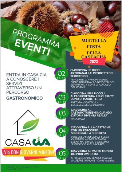 Si tiene da oggi 1° novembre 2023 fino al 5 del mese in provincia di Avellino la 39° edizione della Sagra della castagna di Montella Igp, evento di rilievo nazionale per la castanicoltura, che vede la Campania quale prima regione produttrice di castagne in Italia. E Cia Agricoltori Italiani Campania – nel quadro delle manifestazioni della Sagra di Montella – presenta l’iniziativa “Casa Cia”. Un momento di aggregazione – localizzato in via Don Giovanni Minzoni a Montella – che intende proporre il senso di accoglienza di una grande famiglia, volta a garantire att