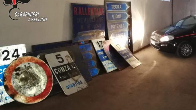 Nel corso di un servizio perlustrativo finalizzato principalmente alla verifica del rispetto delle disposizioni emanate dal Governo per il contenimento della diffusione del Coronavirus, i Carabinieri notavano all’interno di un fondo di Conza della Campania (AV), numerosi cartelli stradali a copertura di un deposito agricolo.