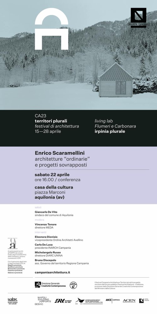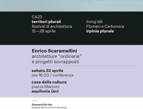 Sabato 22 aprile alle ore 16.00, presso la Casa della Cultura in piazza Marconi, si terrà l’ultimo dei cinque incontri irpini nell’ambito di CA23 Territori Plurali, il Festiva dell’Architettura, progetto vincitore dell’avviso pubblico promosso dalla Direzione Generale Creatività Contemporanea del Ministero della Cultura. Il tema della giornata sarà: Enrico Scaramellini, architetture “ordinarie” e progetti sovrapposti. Introdurrà Giancarlo De Vito, sindaco del comune di Aquilonia. Modererà Vincenzo Tenore, direttore Meda. Interverranno Eleonora Dionisio, vice presidente dell’Ordine degli Architetti PPC di Avellino, Carlo De Luca, presidente Inarch Campania, Michelangelo Russo, direttore Diarch Unina. Concluderà Bruno Discepolo, assessore al governo del territorio della Regione Campania.