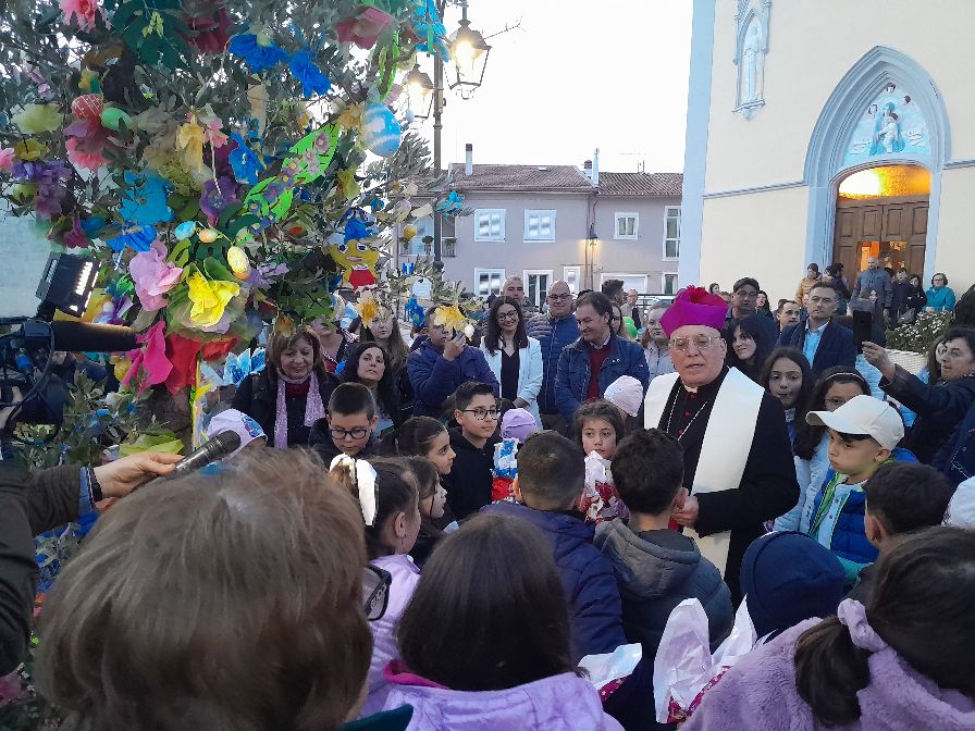 Il secondo evento, svoltosi dopo il concerto è stato all’esterno della chiesa madre di Santa Maria Assunta e San Nicola, dove nell’area antistante era stato posto nella mattinata un Albero di Ulivo in vaso, denominato appunto “ Albero della Pace “, che è stato benedetto da Mons. Sergio Melillo, che al termine ci ha dichiarato : “ siamo qui insieme a tanti bambini e a tante famiglie a celebrare un momento di gioia e di festa, che ci introduce alla settimana Santa, che è il gesto più evidente che Dio nel vederci vivi e risorti. Ed è bello trovarci insieme come comunità, soprattutto con le nuove generazioni, che sono la speranza del nostro futuro e del mondo “.