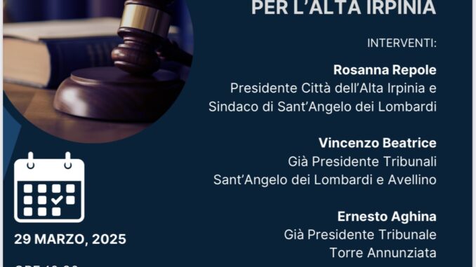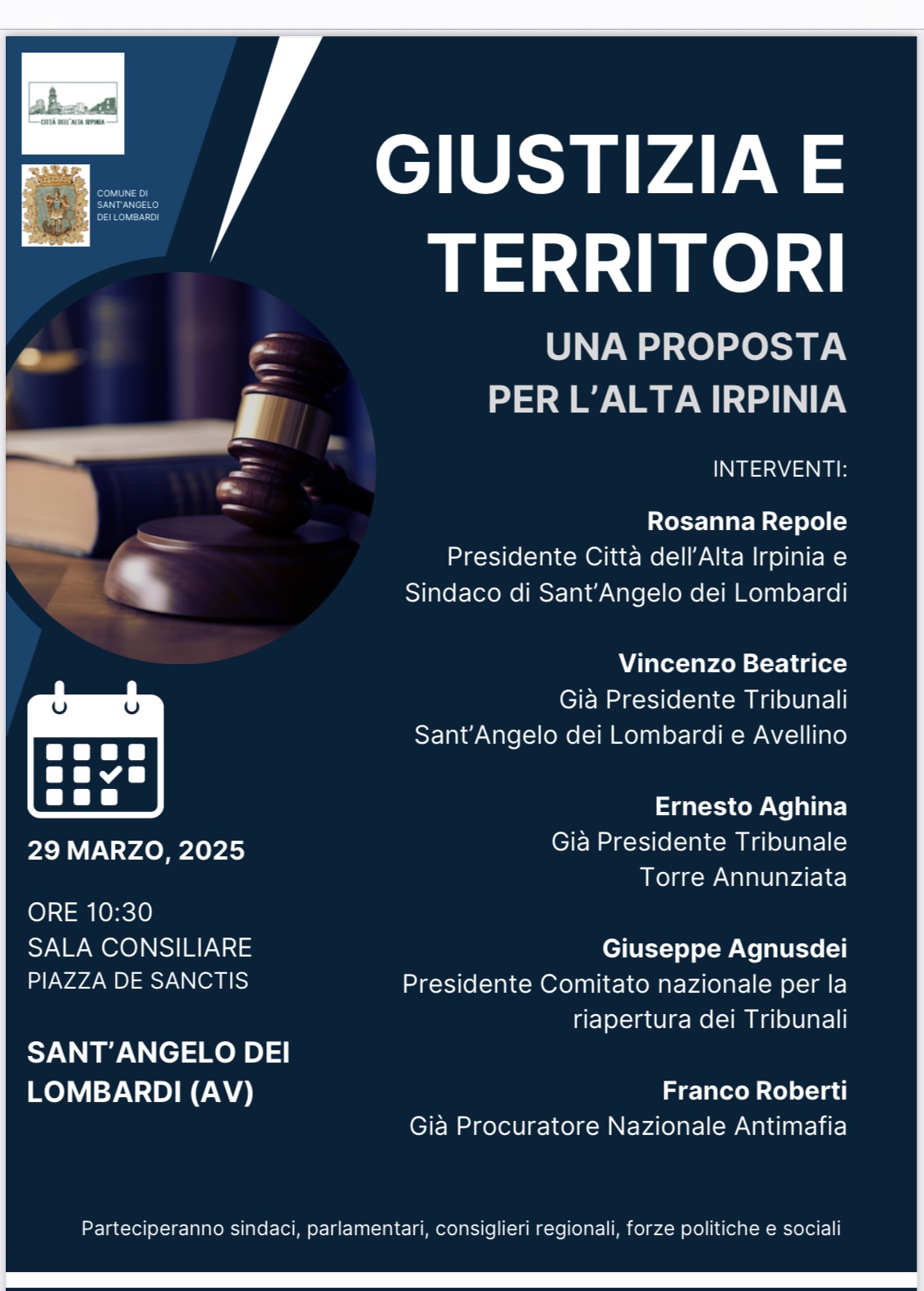 Si terrà a Sant’Angelo dei Lombardi sabato 29 marzo 2025 l’incontro “Giustizia e territori, una proposta per l’Alta Irpinia”. Appuntamento nella sala consiliare, Piazza De Sanctis, alle ore 10:30.