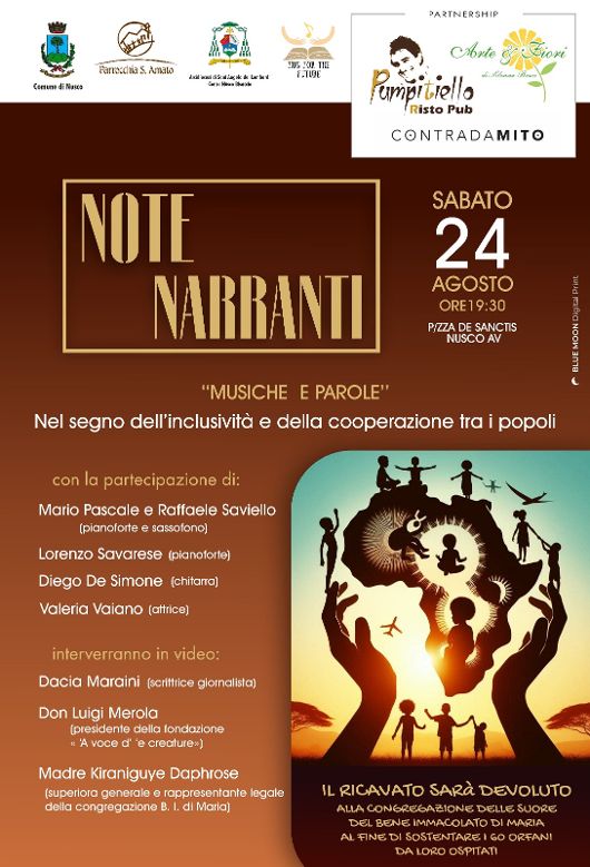 Il 24 agosto 2024, alle ore 19.30, in piazza De Sanctis a Nusco ( AV), con il patrocinio dell’Arcidiocesi di Sant’Angelo dei Lombardi e del Comune di Nusco, si svolgerà l’evento dal titolo “Note Narranti – nel segno dell’inclusività e della cooperazione tra popoli”.L’iniziativa è volta alla raccolta di fondi destinati al sostentamento di 60 orfani ospiti della Congregazione delle suore del Cuore Immacolato di Maria che ha sede nello stato africano del Burundi. La richiesta di sostegno è pervenuta dalla Madre Generale della Congregazione presso la quale il medico chirurgo di origini Nuscane Antonio Ebreo presta periodicamente servizio volontario. L’attuale situazione del Burundi è particolarmente difficile e complessa: nonostante segnali di apertura e miglioramento, la regione rimane ancora oggi intrappolata nella crisi economica e politica scoppiata nel 2015.La serata sarà allietata dalle esibizioni di giovani e Talentuosissimi musicisti: il pianista Lorenzo Savarese che proporrà un repertorio incentrato su Chopin, Mario Pascale e Raffaele Saviello in duo per pianoforte e sassofono, Diego De Simone per chitarra solista. È previsto altresì l’intervento in video di tre “parolieri”: la scrittrice Dacia Maraini, che proporrà il suo punto di vista sulla cause e le possibili soluzioni ai conflitti militari in atto nel mondo, con l’ auspicio di una fattiva cooperazione fra popoli, Don Luigi Merola – prete anticamorra – che porterà i saluti e la vicinanza della sua fondazione alla causa della serata e infine la Madre Generale della Congregazione, la quale illustrerà brevemente le problematiche che la sua congregazione è chiamata ad affrontare quotidianamente nella preziosa opera di sostegno alla popolazione locale. Nel corso dell’evento si potranno gustare ottime pietanze e vini di pregio, in una serata che si prefigge di offrire intrattenimento di qualità ma che metterà al centro il fine umanitario e la necessità di non restare Indifferenti di fronte a problematiche che ci appaiono lontane ma che dovrebbero coinvolgerci tutti.