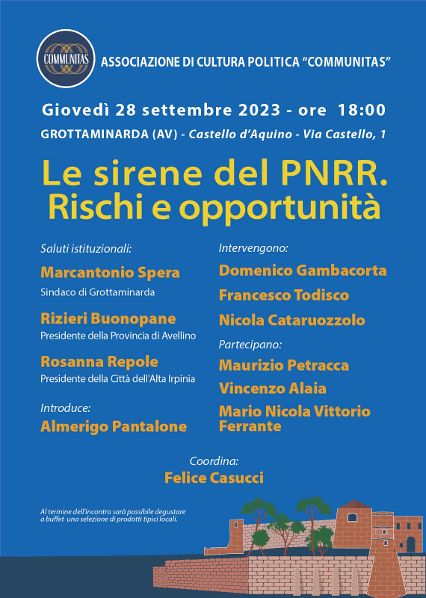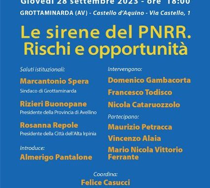 PNRR. Rischi e opportunità”, che si terrà giovedì 28 settembre 2023 alle ore 18.00 presso il Castello d’Aquino a Grottaminarda (AV).