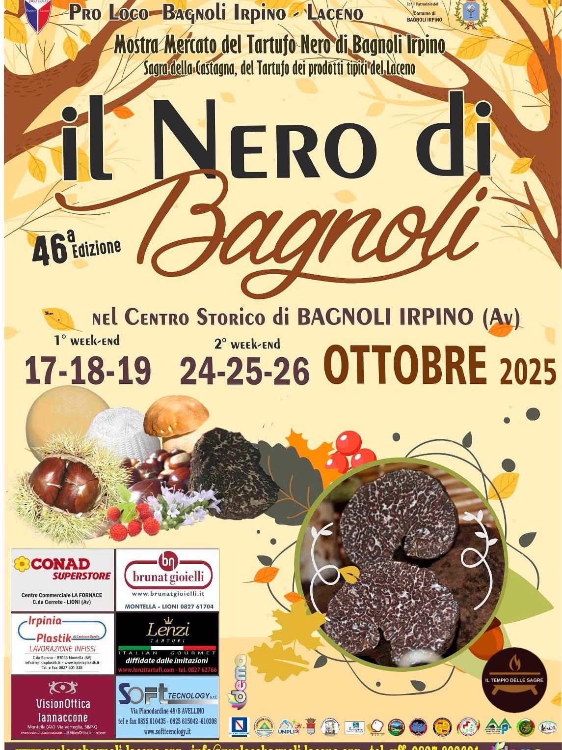 L’autunno irpino quest’anno si accende di profumi, sapori e allegria con la 46ª edizione della Mostra Mercato del Tartufo Nero e Sagra della Castagna, meglio conosciuta come “Il Nero di Bagnoli”. Due weekend imperdibili, dal 17 al 19 e dal 24 al 26 ottobre 2025, trasformeranno il centro storico di Bagnoli Irpino in un vero e proprio teatro di festa, tra storia, tradizione e bontà di montagna, ai piedi del Lago di Laceno.