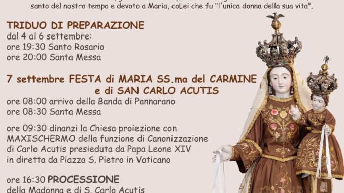 La ricorrenza cade nella vigilia della festa della Natività della Beata Vergine Maria e unisce la tradizionale devozione alla Madonna del Carmine con l’esempio luminoso del giovane San Carlo Acutis, recentemente elevato agli onori degli altari e profondamente legato alla spiritualità mariana.