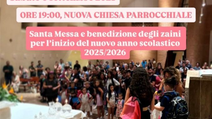 Sabato 6 settembre 2025, alle ore 19:00 presso la nuova chiesa parrocchiale, si terrà la Santa Messa con la benedizione degli zaini in occasione dell’avvio del nuovo anno scolastico 2025/2026.