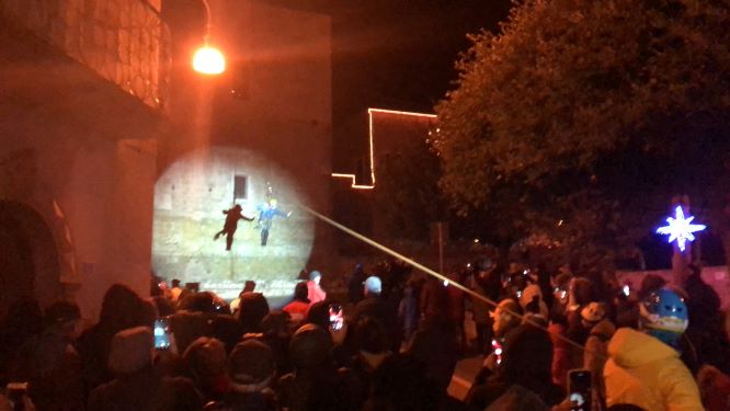 Anche l’arrivo della Befana, previso per domenica 5, è stato un successo. Tutto si è svolto secondo programma, nonostante il freddo intenso e le raffiche di vento gelido. La Befana è arrivata in piazza De Sanctis camminando sui trampoli e mano nella mano con i bambini della Scuola san Giovanni Bosco e dell’I.C. Criscuoli: con il festoso corteo di bimbi travestiti, accompagnato da una musica tradizionale di fisarmoniche e tamburelli, si è diretta alla Casetta della Befana, posizionata in una piazza addobbata da centinaia di calze realizzate anch’esse dai bambini santangiolesi. L’affabile vecchietta ha aperto la sua dimora e ha interagito con i presenti, mentre all’esterno era possibile gustare dolci e cioccolata calda o assistere, al calore di un grande braciere, agli spettacoli con il fuoco e con le bolle degli artisti di strada della Compagnia dei Saltimbanchi. Infine la Befana si è mossa verso il Castello degli Imperiale dove, con l’esperto intervento del gruppo Speleo Team Montenero di San Marco in Lamis, si è calata dalla finestra della torre per scendere di nuovo in mezzo ai suoi bambini e offrire caramelle a tutti. Il volo è stato sicuramente il momento clou del pomeriggio, che ha regalato gioia ed emozione ai più piccoli, i veri protagonisti della manifestazione.