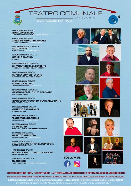 Per abbonamenti e informazioni: segui la pagina ufficiale del Comune di Lacedonia o contatta la biglietteria del Teatro Comunale.
