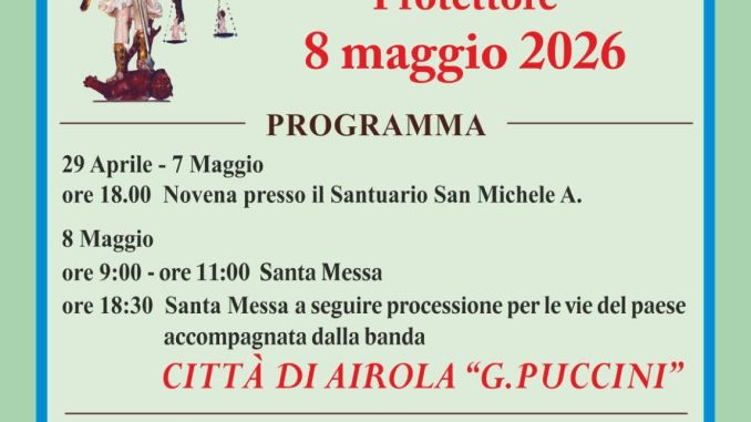 I festeggiamenti saranno preceduti dalla novena, in programma dal 29 aprile al 7 maggio, ogni giorno alle ore 18 presso il Santuario di San Michele Arcangelo.