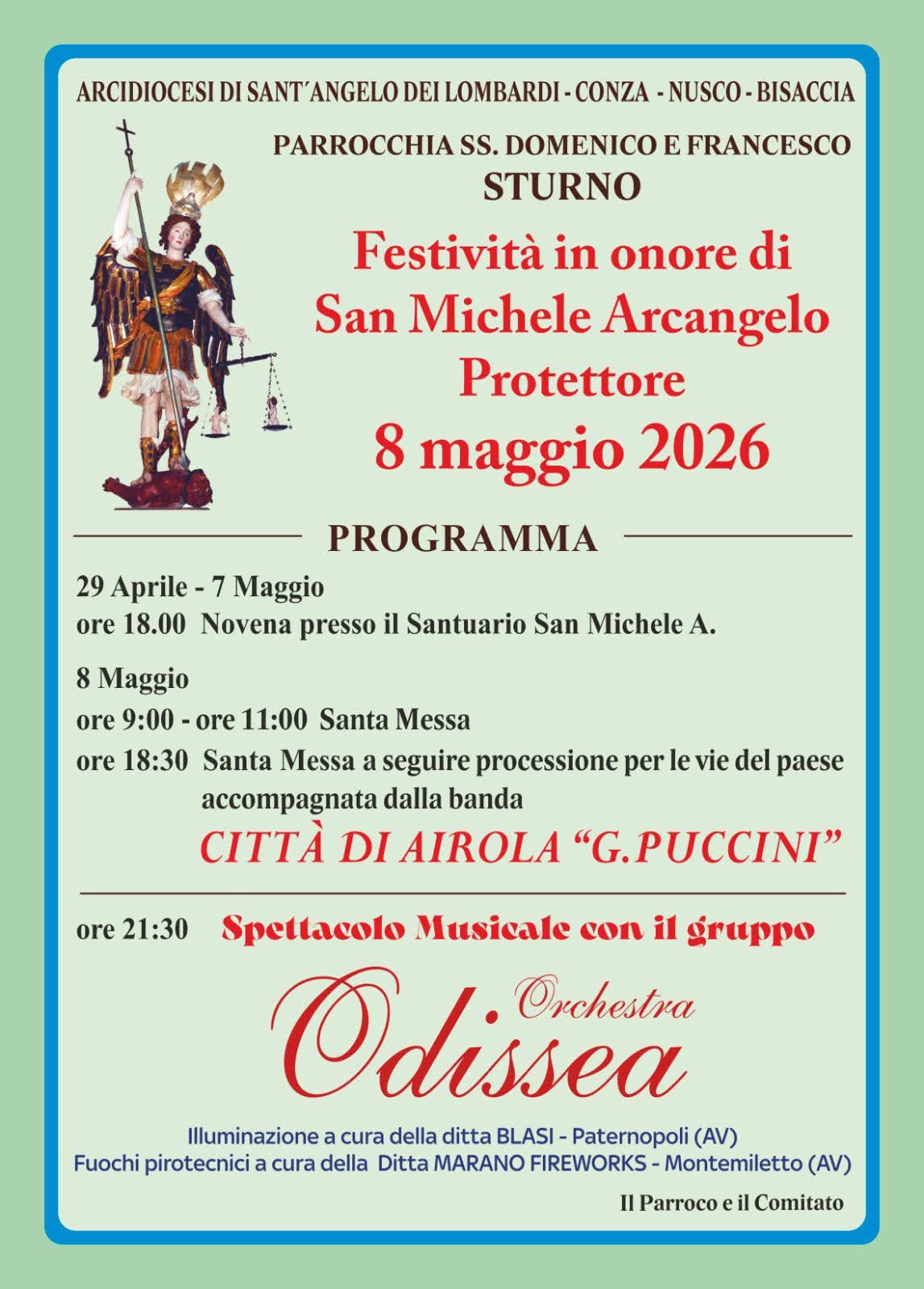 STURNO – Si rinnova anche quest’anno uno degli appuntamenti più sentiti dalla comunità: le festività in onore di San Michele Arcangelo, patrono di Sturno, in programma l’8 maggio 2026.