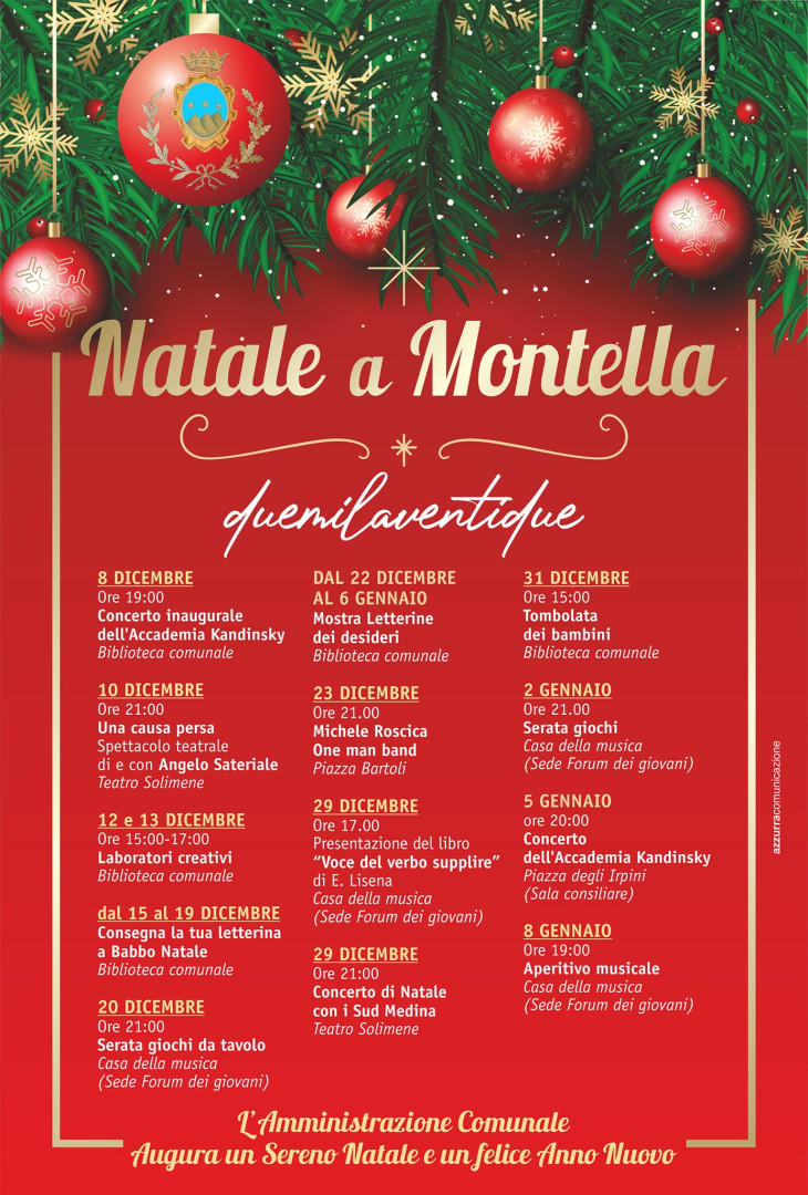 Ad aprire il cartellone di eventi è stato il Concerto inaugurale dell’Accademia Kandinsky presso la biblioteca comunale il giorno 8 dicembre. Un concerto che ha dato il via al nuovo Anno Accademico 2022/2023 con le musiche di Martina Barbone. Il 10, invece, Angelo Sateriale ha portato in scena presso il Teatro Solimene di Montella la sua commedia “Una Causa Persa”, evento inserito nel cartellone come evento conclusivo della rassegna teatrale.