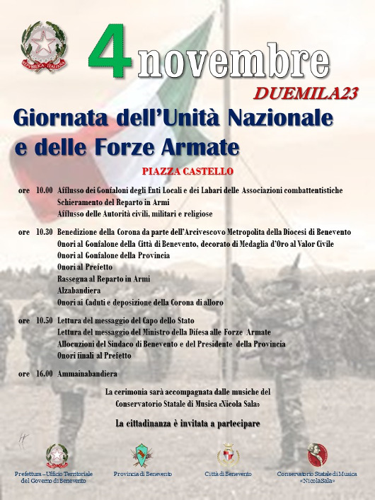 Il Prefetto, insieme alla massima autorità militare, al Sindaco di Benevento ed al Presidente della Provincia, deporrà una corona di alloro benedetta da S.E Mons. Felice Accrocca e condotta da due agenti appartenenti alla Polizia di Stato ai piedi del Monumento ai Caduti, dando successivamente lettura del messaggio del Capo dello Stato.