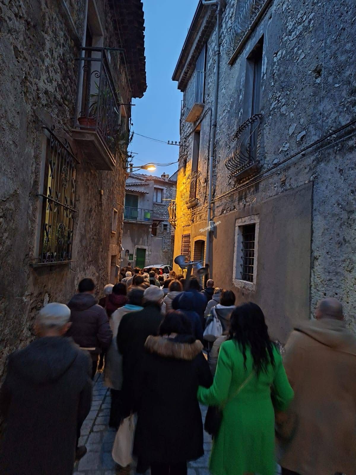 Le strade acciottolate, le luci soffuse del tramonto e il coinvolgimento sincero dei partecipanti hanno contribuito a creare un’atmosfera densa di emozione e raccoglimento. Un’iniziativa che non è solo rito religioso, ma anche gesto di appartenenza e memoria collettiva, che rinsalda l’identità e il senso di comunità del paese.