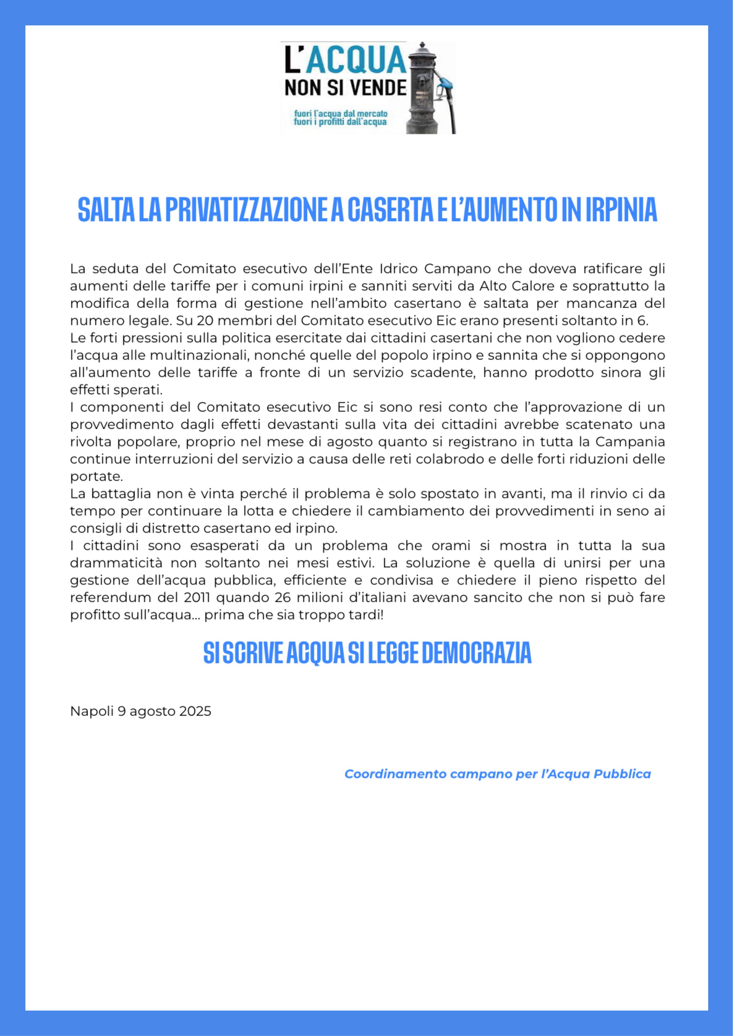 Le forti pressioni sulla politica esercitate dai cittadini casertani che non vogliono cedere l’acqua alle multinazionali, nonché quelle del popolo irpino e sannita che si oppone all’aumento delle tariffe a fronte di un servizio scadente, hanno prodotto sinora gli effetti sperati.