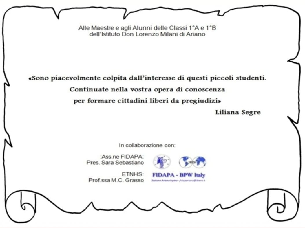 alla Senatrice la quale, tramite l’Associazione ETNHS -European Teacers Network Holocaust- ha cortesemente risposto: «Sono piacevolmente colpita dall’interesse di questi piccoli studenti. Continuate nella vostra opera di conoscenza per formare cittadini liberi da pregiudizi».