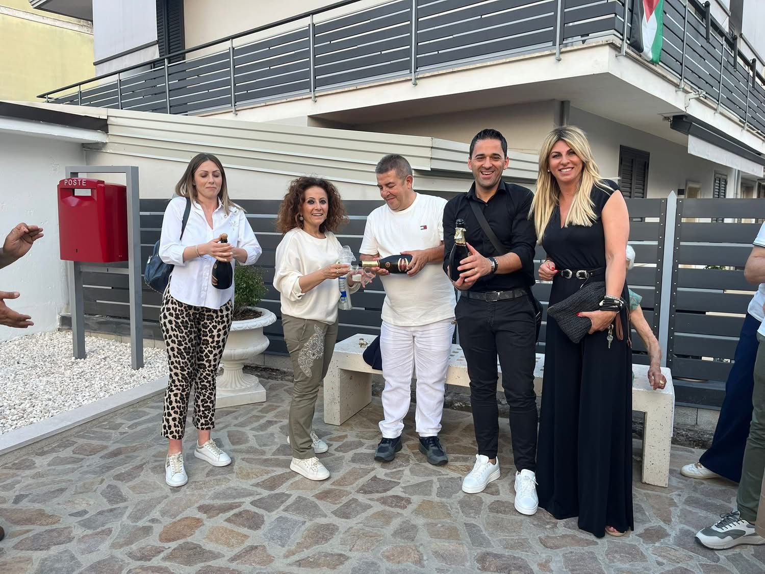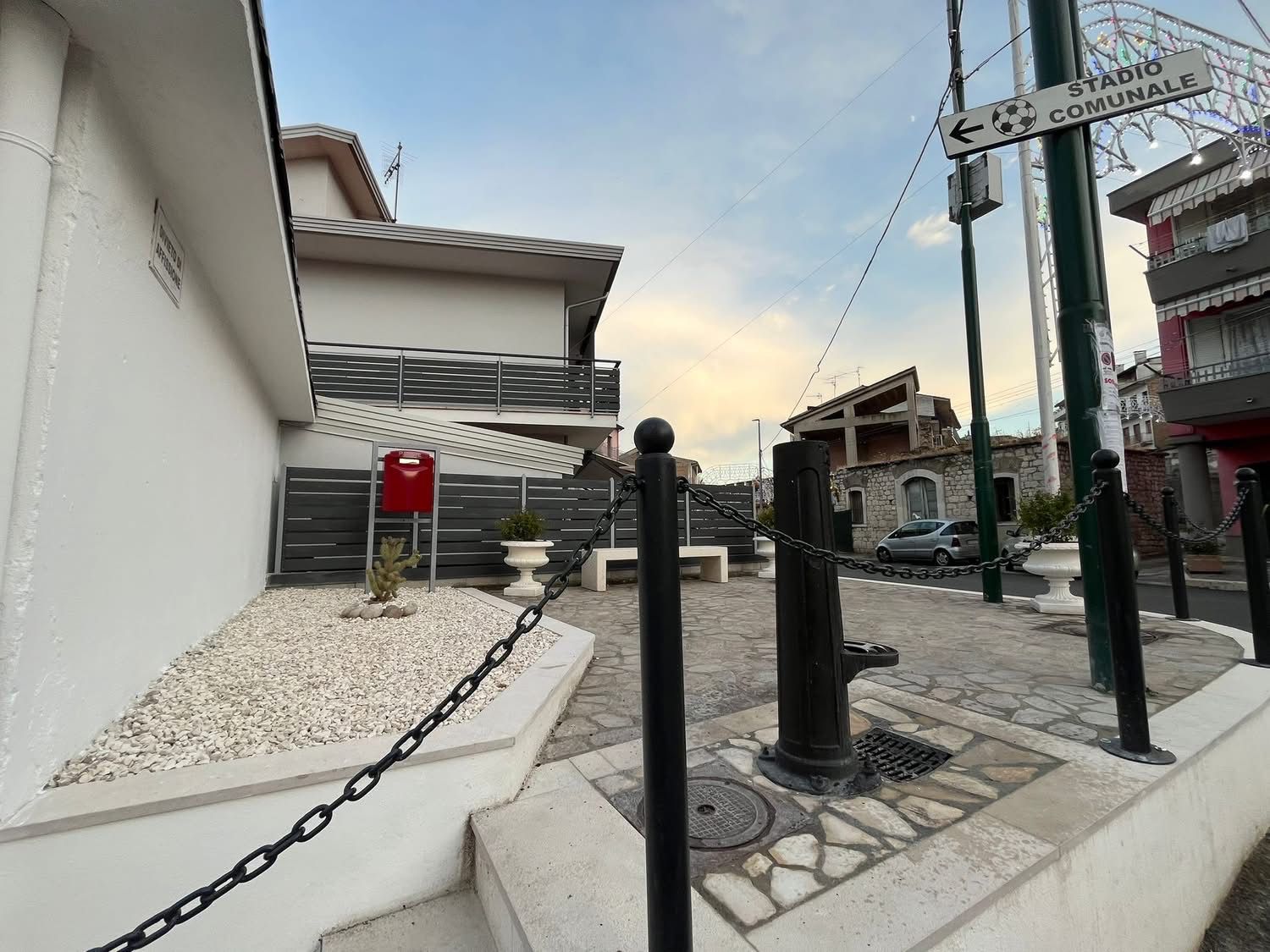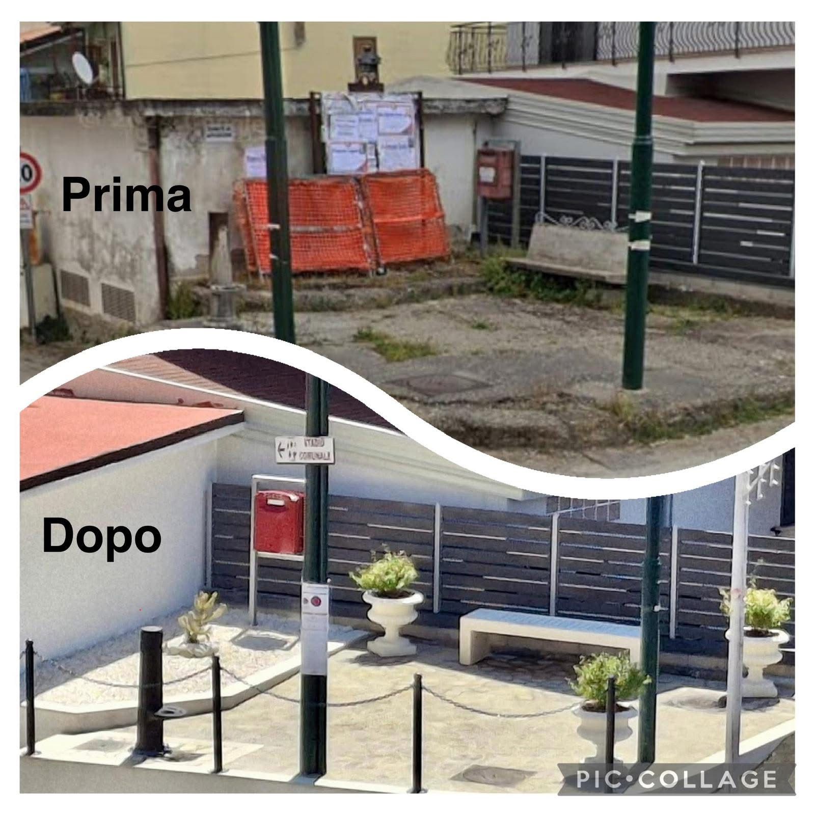 Lo spazio è stato completamente ripavimentato e ripitturato. Sono stati aggiunti nuovi elementi di arredo urbano come fioriere (una donata dal Comitato Festa di Sant’Antonio e Santa Rita), dissuasori stradali con catene per delimitare l’area pedonale, una panchina, e sono stati mantenuti e valorizzati elementi storici come il fontanino di acqua potabile e la buca delle lettere, ancora regolarmente funzionante.